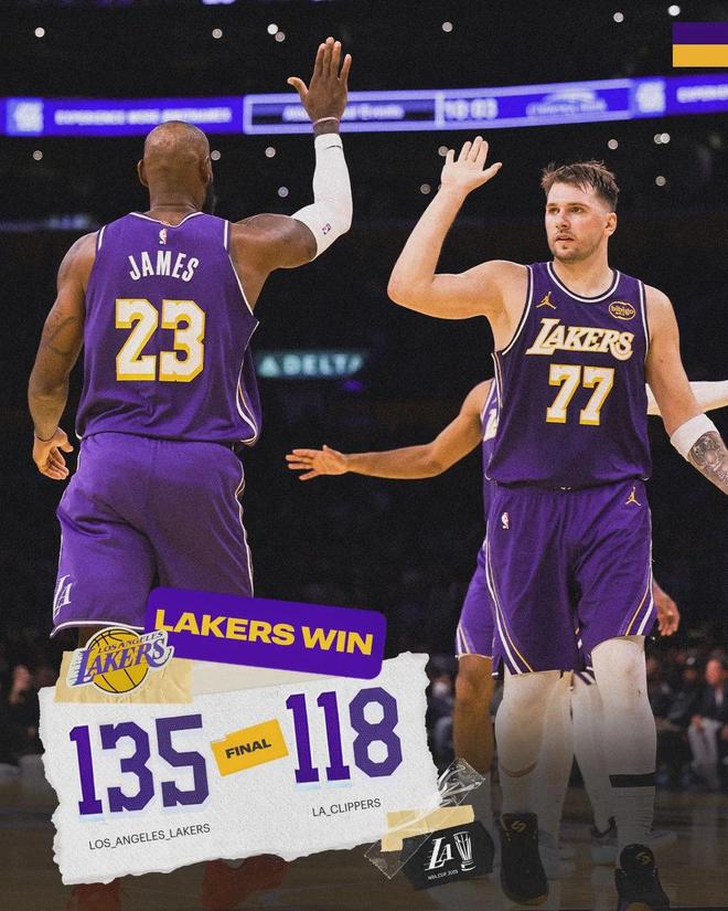 邓恩被直接驱逐,海斯吃了个技术犯规。比赛已经没悬念了,全场结束,湖人135-118大胜快船。湖人双喜临门:重返西部第二;小组出线,锁定NBA杯的淘汰赛资格。东契奇43分9板13助、里夫斯31分9板3助、詹姆斯25分6板6助。