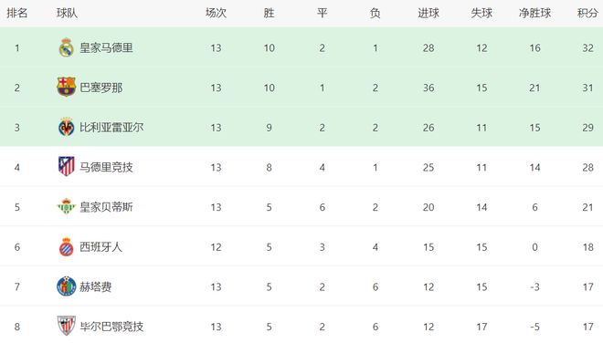在积分榜上,皇马以32分重登榜首位置。只是皇马的优势很小,只领先身后的巴萨1分。比利亚雷亚尔以29分排名第3。第4的马竞拿到28分。前4差距最多只有4分,冠军的争夺还是很激烈的。第5名的是皇家贝蒂斯,只拿到21分,要想杀入欧冠区有点困难。西班牙人以18分排名第6。